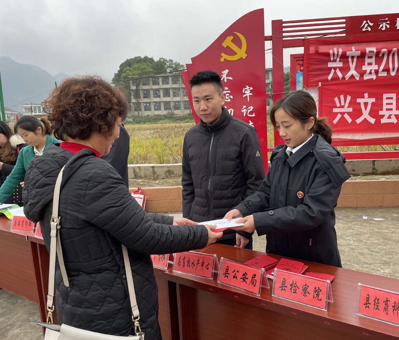 通过宣传活动向群众发放宣传材料300余份,现场解答群众咨询12人次,进一步增强群众宪法意识、法治意识、环保意识,弘扬了宪法精神,积极引导百姓学法、懂法、运用法律维护自身合法权益,为加强宪法实施,全面推进依法治县、建设法治兴文营造了良好的氛围。(罗莉)