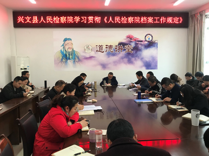 四川法制在线宜宾3月2日讯 为推进新时代检察档案工作,全面贯彻新发展理念,推进档案科学、规范管理,近日,宜宾市兴文县人民检察院召开全院干警大会,专题学习《人民检察院档案工作规定》(以下简称《规定》),会议由兴文检察院党组副书记刘虎主持,全院干警参加了会议。